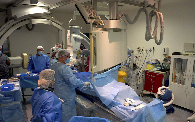 La intervención fue encabezada por el Dr. Andrés Concha, radiólogo intervencional del HGGB, junto a un equipo multidisciplinario de la Unidad Neurovascular, con la colaboración de los destacados especialistas internacionales Dr. Héctor Ferral (Louisiana State University, Nueva Orleans) y Dr. Behrens, quienes participaron como asesores durante el procedimiento.